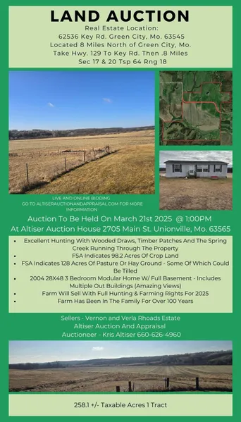 Property Features: FSA indicates 98.2 acres of cropland with approximately 73 in current production. 128 acres of pasture or hay ground of which is in current hay production. Excellent hunting with plenty of deer and turkey. Soil types include Arbela/ Landes/ Winnegan/ Gorin. Property sells with 2004 modular home on a full basement. The home measures 28x48 and has 3 bedrooms. Home sits atop the ridge and overlooks the whole bottom. There is an old homestead on the north side of Key road that features a barn and outbuilding. Electricity is on the north side of the road. Water is fed from a well.