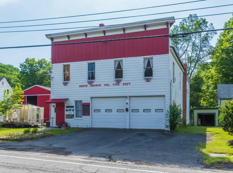 Extremely unique property! Plenty of space in a great location! This former Firehouse, dead center of desirable North Branch, 5 miles from bustling Callicoon and 4 miles from developing Jeffersonville, has many possibilities both residential AND commercial. Upon entry, the Kohler-built staircase takes you up to the 2nd floor, with mid-century vibes; high ceilings, a hard-pine, polished wood floor, broad window casings, small stage, 4 closets, open living/dining/exercise space, separate bedroom. Formerly used as a dance hall, currently used as a high-end vacation rental, with full sized kitchenette, but could be a separate apartment with a dedicated bathroom off the first-floor entry foyer. Could be a great live/work yoga studio, dance studio, personal trainer studio, meeting hall. On the first floor, with a separate entrance, high ceilings, a huge kitchen, large bathroom, bedroom, large living area/open space with plenty of room to easily add a second bedroom or office or your own reconfiguration. 2 car (truck) garage, formerly the firehouse apparatus room, with 10ft. ceilings, currently used as an artist work/show space, could also be used as workshop or studio. There are 2 outbuildings. The first is a 1440 sq. ft. metal pole building on a poured cement foundation with 14ft.X14ft. sliding doors and an18ft. peak, currently used as a sculpture studio, could be a workshop, car or boat storage, etc. The second is the original, wooden, 1800’s Firehouse, 270sq ft. with a poured concrete slab, currently used for storage. Enjoy and entertain outdoors with an easily maintained yard that boasts mature fruit trees (apple, pear, peach, plums) and 50, high yielding blueberry bushes and many rhubarb plants.There are 2 potential, separate heating units and many of the amenities were installed by the current owner: Septic (2011), Well pump (2004) water heater (2021), oil furnace (2022), propane furnace (2020), metal roof, pecks plumbing. For the price of a NYC one-bedroom apt. you can create your dreams! If you have a vision, this is the property for you!