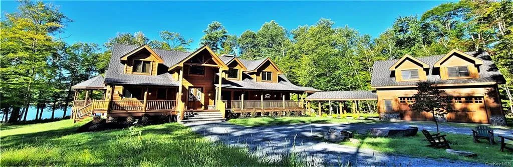 The Red Fox Lodge will keep you safe and sound, free from all the stress and burdens of the world. Upon entering, you are immediately drawn to sweeping views of the Toronto Reservoir. With sought-after Adirondack style wrapped in nature, this cedar and stone beauty will ignite your senses. Upscale rustic finishes throughout include double stained glass entry doors, blonde Wormy Maple floors, hand-made leather door pulls, imported tile, native stone, wood inlay, custom built hide-away wet bar, artisan carvings and much more! Rustic-modern kitchen with contoured concrete island is a chef s dream boasting top-of-the-line appliances and ample work space. Perfectly appointed interior offers 4 BR s (including carriage house guest-suite), den, designated office space, 4.5 Baths, 3 fireplaces, open plan and expansive outdoor decking plus gazebo. With 5 acres of property and over 500 ft. of water...