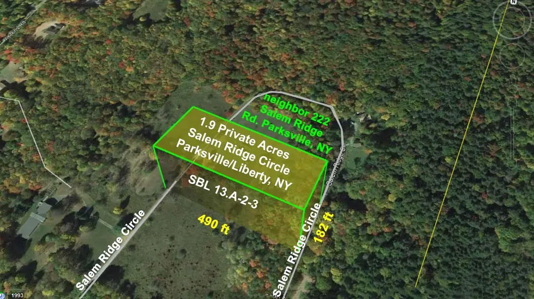 Enter 222 Salem Ridge Circle, Parksville, NY into your GPS. This is my neighbor at the bend in the horseshoe part of the road (see map below). I have road frontage on both sides of the property Ive placed orange streamers at each of the 4 corners (approx) and my For Sale sign (888) LAND-005.