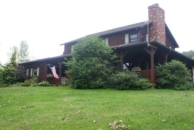 Relax and stay! Charming log home features a new kitchen with granite countertops, new wider-plank wood and tile floors, large windows, brick fireplace, a great floor plan with a full bath on each level, some log interior walls, basement with high ceiling and a coal stove. Landscaped setting with lots of perennials, walk out the back door through an arbor with 4 varieties of grapes, wrap around porch, brick sidewalks, 2 car attached garage, 1 car detached garage/workshop. Very private setting - yet close to town. Awesome view included in the sale price.