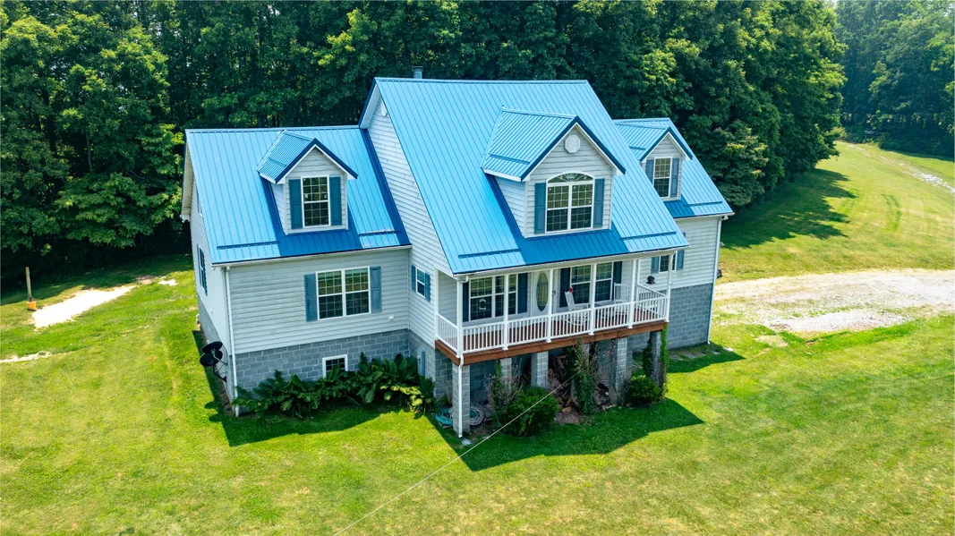 A gravel drive leads through pastures to the large, attractive home with an eye-catching blue metal roof. Entry is through the lower-level garage. The expansive open-plan great room incorporates the living, kitchen, and dining areas and offers ready access to the covered porch and back deck.
