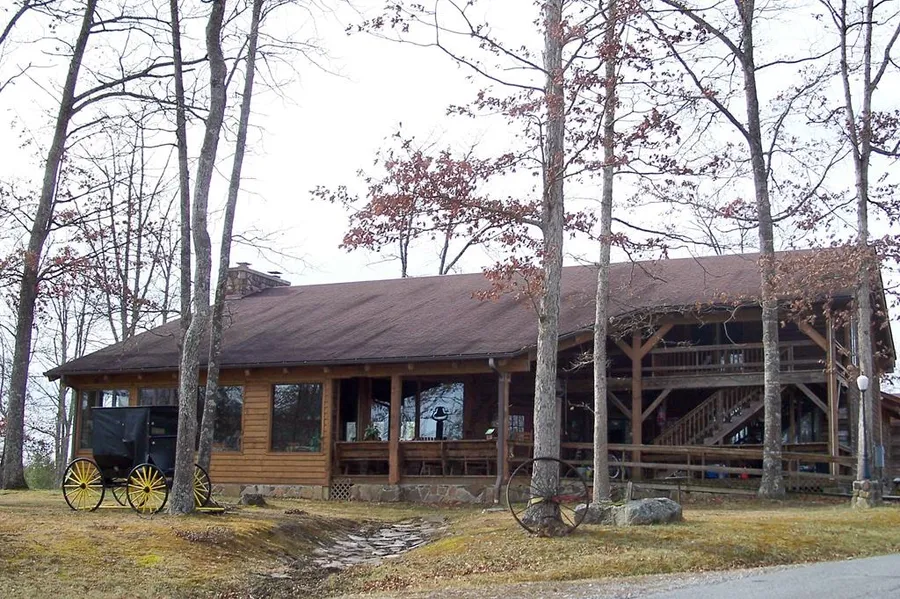 Property has been as a residential home, a lodge, a B&B, and an event center. Interior has 31' open beam ceilings, barnboard paneling, majestic native stone double fireplace, 3 single bedroom suites with full baths, 3 double bedroom suites with full baths, an exterior apartment (1 bdrm, kit, bath), and two bedrooms and a bath upstairs. Main level has a great room with bar, game room, sun room, dining room, kitchen and pantry. Oak floors, cedar siding, anderson windows.