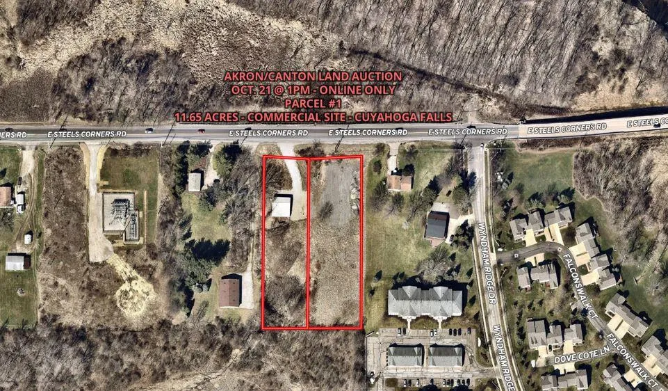1.65 Acres - Commercial Site - Cuyahoga Falls. ONLINE BIDDING ONLY OCT. 10-21 1PM. Excellent Commercial Development Opportunity to build on busy E Steels Corners corridor. Located just 1/2 mile west of RT 8, near a variety of amenities, including restaurants, retail, hospitals and more. The property sits just inside of Cuyahoga Falls in the E-1 zoning district. Uses can include retail center, office, medical, and more. All utilities through the City of Cuyahoga Falls. Daily Traffic Count 14,774. Any desired inspections to be completed prior to placing bid.