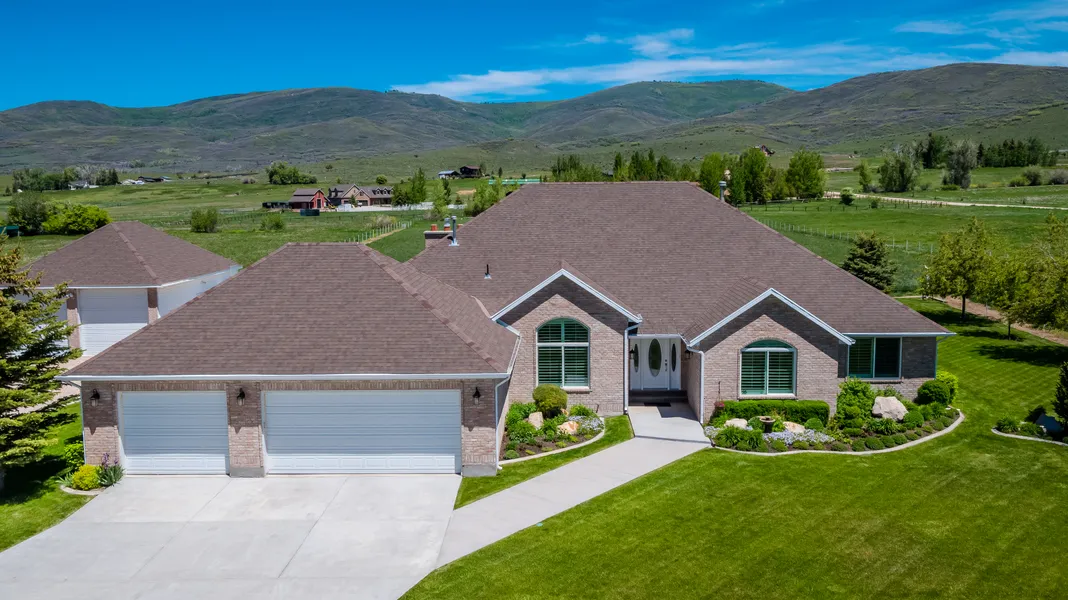 Current Appraisal | Fantastic Opportunity Sitting at the foot of the spectacular Uintah Mountains is a fabulous home, perfectly located on the very desirable north bench of Oakley. This home is meticulously kept, inside and out, and shows pride of ownership in every detail. Cozy interior, a wonderful kitchen with top shelf appliances, custom cabinets and silestone quarts counter tops. A great living space for you and property for your horses. The floor plan is very comfortable and supports single level living with the master suite and bedrooms on the main level. It also has a great family room area up for the kids get-away. The home sits on 5 pristine acres planted in grass hay complete with pressurized irrigation and Includes 7 shares of New Field and North Bench Irrigation Co. There is a huge 3 car garage AND a 1000 square foot RV garage/toy barn/shop with 220 V for tractors, trailers,...