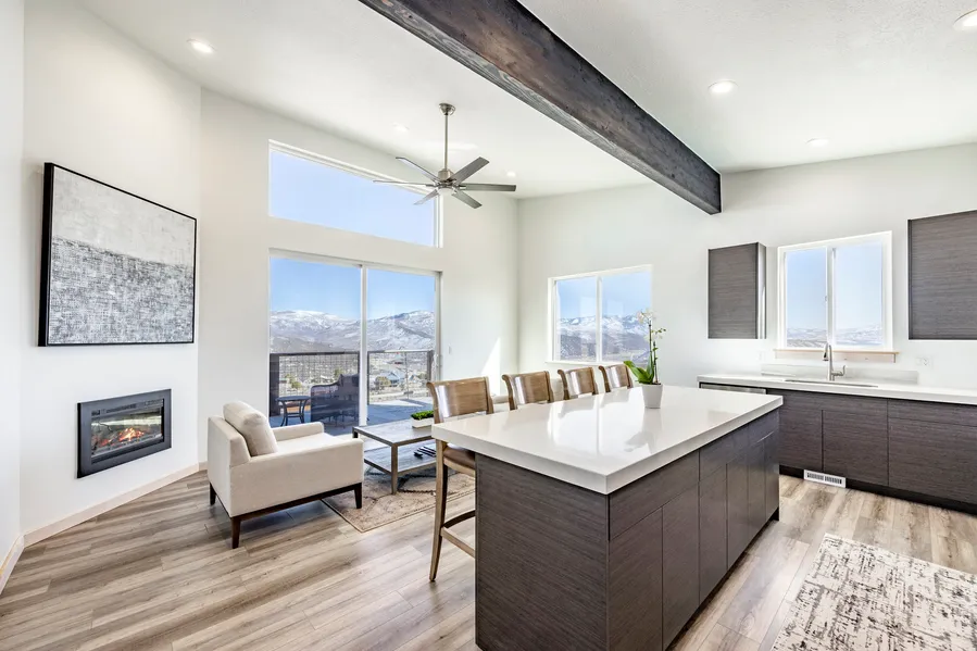 Finding a nearly new modern jewel with panoramic water views from every room in the house is a rare find in Rockport Estates. Enjoy the full-length deck to watch the sunrise or host barbeques while taking in the lake views and wildlife. Rockport Reservoir is in your backyard for picnics, boating, fishing and kayaking or stand-up paddle boarding. In winter, ice fish and access nearby snowmobile trails. Main floor primary bedroom with ensuite bathroom and large walk-in closet with private access to the deck. Both the deck and covered patio flow seamlessly from the living areas for indoor/outdoor living and entertaining. Enjoy soaring ceilings, custom cabinetry, quartz countertops, stainless appliances, and a gas fireplace. Air conditioning and UV tinted windows were recently added to provide year-round comfort. Attached two car garage has recently been insulated for ample storage. This modern custom home is set on over an acre with a major hardscape project that includes a 30-foot terraced rock wall providing usable yard space, and a widened driveway for parking vehicles with ease. If you are looking for stunning panoramic lake views in a private gated enclave, this home is a must see. Close proximity to the Lodge at Blue Sky and High West offer nearby options for entertainment. Only 25 minutes to Park City ski resorts and 15 minutes to Park City and Kimball Junction for all of your shopping and dining needs.