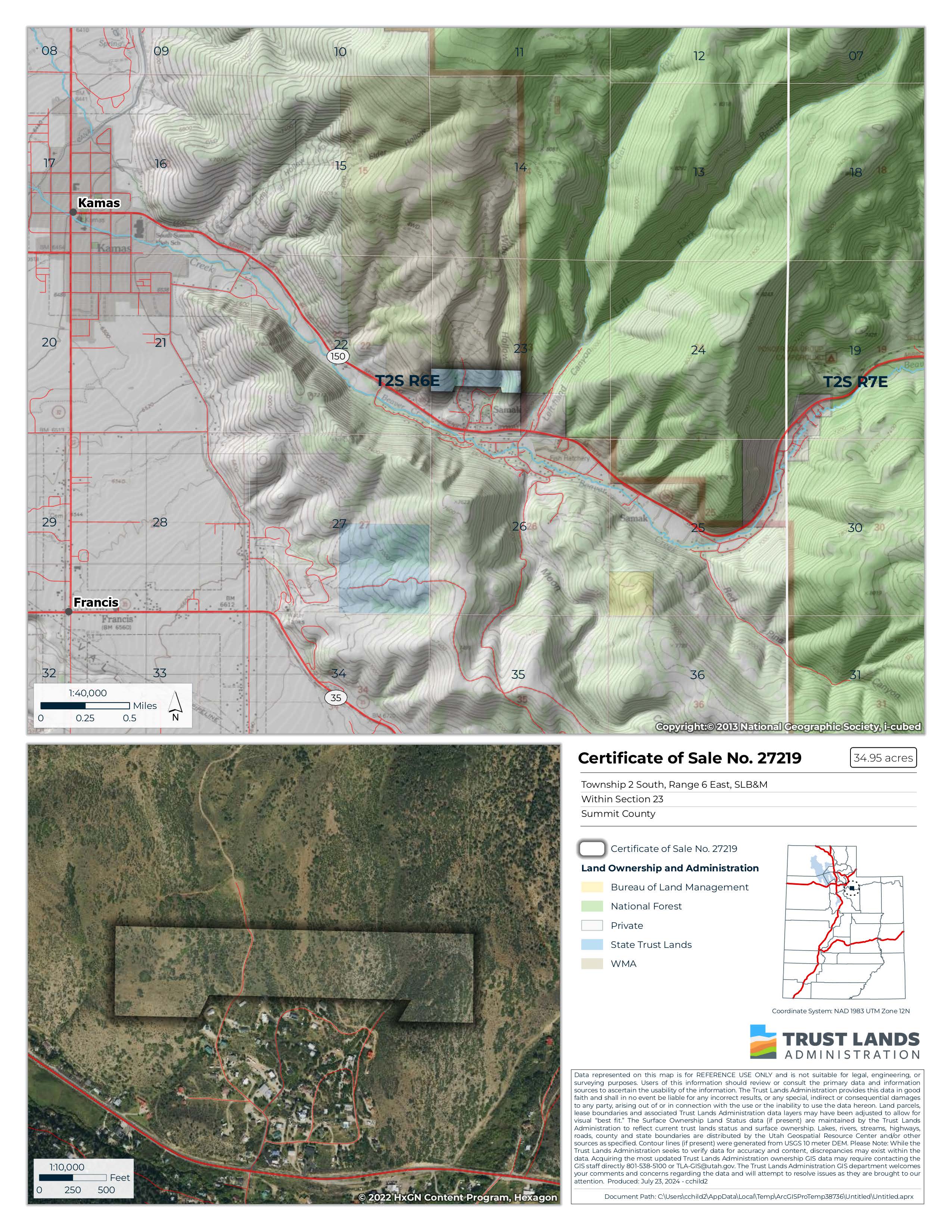 Utah Trust Lands Administration will be selling property near Kamas at an online public auction to be held November 14-19, 2024. This 33.85 acre property is located in the foothills above the Wide Hollow Subdivision, which is approximately 2 miles southeast of Kamas, in Summit County. The minimum acceptable price is $620,000. Financing is available.