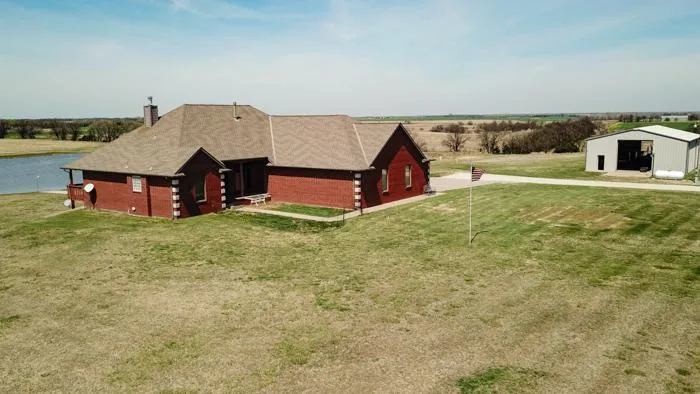 Imagine coming home to the country home you've always dreamed of owning. You pull into your long driveway that leads up to your big, beautiful, all brick constructed, split-level home with a large all steel constructed shop with oversized doors and concrete floor. You pull into the driveway of the house and up to the giant, two (or more) car garage that is perfectly positioned on the side of the house, not to take away from the beauty of the front, or the serenity found out back. Inside you step into the huge center stage of the house with a vaulted ceiling running from the open kitchen and dining room into the front family room with a fire place, adjacent to the sitting room/TV room. You instantly feel the calming effect and immediately notice the primary reason you bought this home, the incredible view out of every window in the house. Looking back across the 80 acres it sits on with a one-and-a-half-acre pond and rolling hills of prairie grass. You can watch the ducks, geese, Purple Martins, and other birds come and go, as well as the local deer that frequent the pond for a drink, or to play out in the prairie hay.