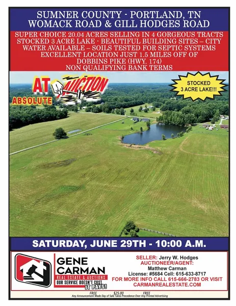 AT ABSOLUTE AUCTION SATURDAY JUNE 29TH AT 10:00 A.M.! Consists of an outstanding 20.04 acres that has been surveyed, platted and staked to be sold in 4 gorgeous tracts. All tracts are 5.01 acres in size with two tracts fronting on Womack Rd. and two tracts fronting on Gill Hodges Rd. All tracts lay level to very gently rolling, have city water available and have been soils tested for septic systems! You must see the amazing 3-acre stocked lake that is shared between tracts #1 and #2! You will love it! Come build your dream home overlooking the water and enjoy your own private fishing hole! All tracts have been improved with driveway entrances and are ready for your new home!! Property is conveniently located to Gallatin, Portland and Westmoreland and is approx. 45 miles from Nashville!! This is an auction that you will not want to miss! Also, do not forget about the excellent non-qualify...