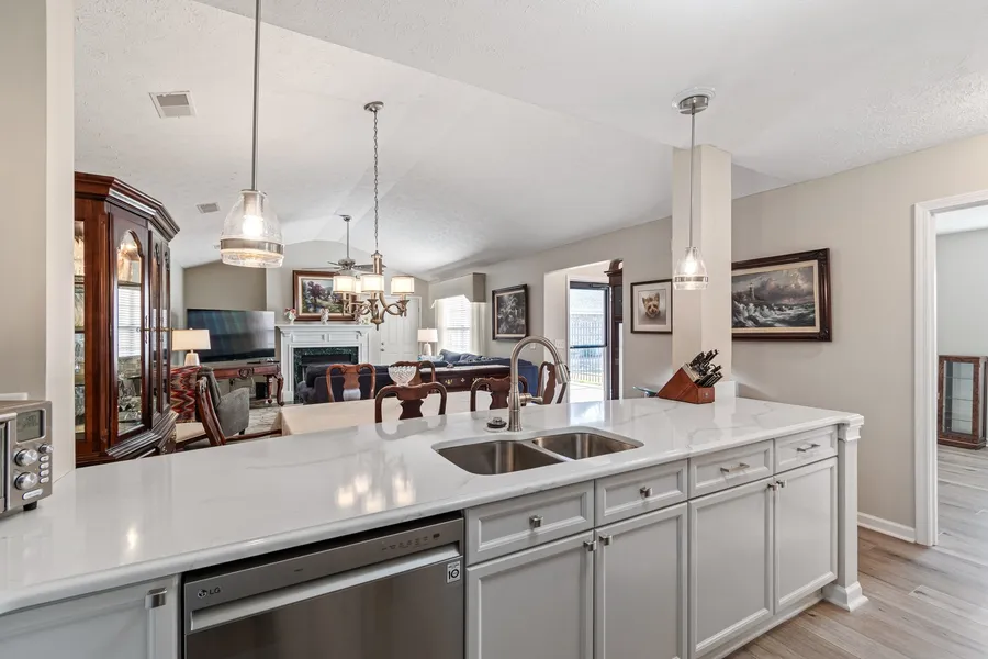 One level living at its finest! Renovated with a stunning kitchen, open floor plan, new floors. Meticulously maintained, this one is a must see! Gated sun-filled courtyard with large green space and trees next to it. High ceiling living area with fireplace. Spacious two car garage. Ample closet space. Light hardwood throughout. Stainless appliances. Beautiful kitchen renovation with large countertops and cooking space. Nice, bright white lighting and natural light fill the rooms. Updated bathroom cabinets. Large tub in primary bath with separate walk in shower. Great unit location at back of complex and an end unit.