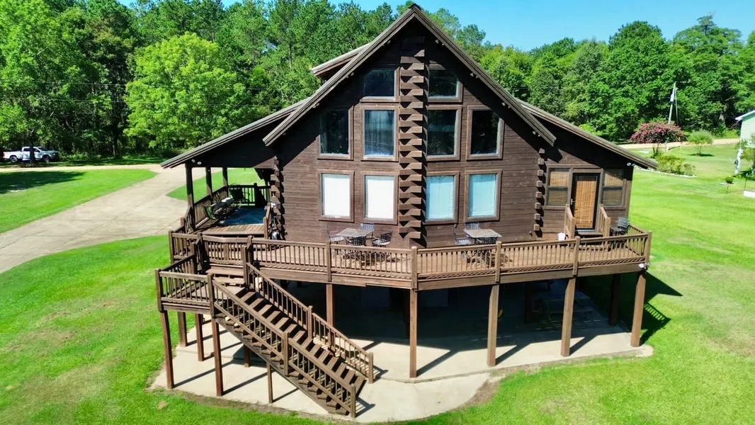 The home is constuctured of solid cedar logs, and the beautiful floor to ceiling windows offer spectacular views of the Tombigbee River.