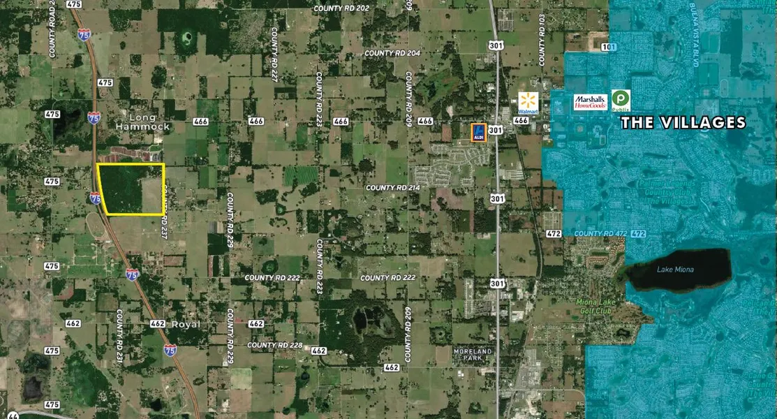 Just 4 miles to The Villages! The Villages, an age-restricted community, is one of the fastest-growing master planned communities in the United States! Spanning portions of three counties (Lake, Marion and Sumter), The Villages exceeds 130,000 residents. This property boasts over 3,000 ft of frontage both Interstate 75 and CR 237. Short 10-minute drive to The Villages, 1 hour to Gainesville or Orlando, 30 minutes north to World Equestrian Center. Close to new 1.7million SF Dollar Tree Distribution Center facility.