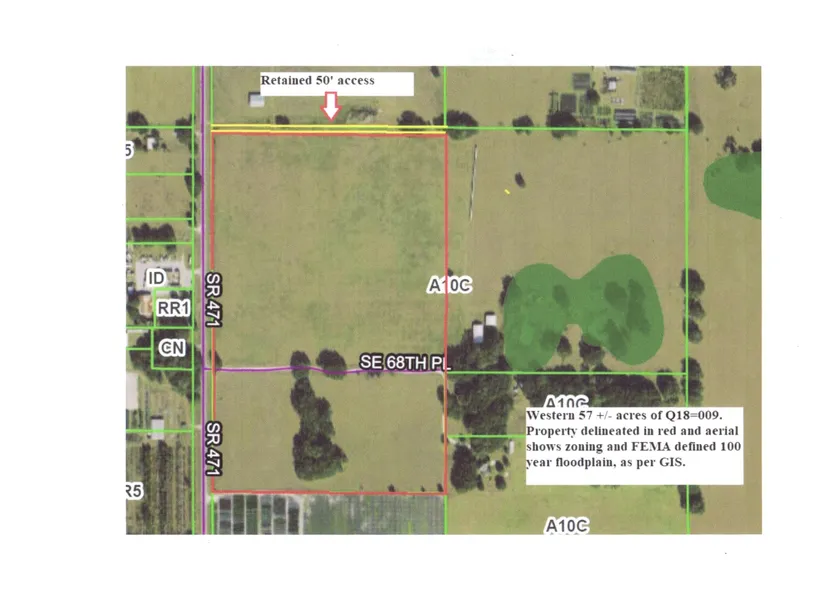 57+/- vacant acres, in close proximity to thousands of acres recently purchased for the likely expansion of The Villages in Sumter County, FL. The property abuts busy SR 471 and is situated approx. 2000 FT north of the SR 471 and C-48 interchange. The property consists of cleared and improved pasture, and per the Sumter GIS, none of the 57+/- acres is encumbered by the FEMA defined 100 year flood plain. It has been recently reported that according to current census data, The Villages MSA is experiencing one of the fastest growth rates in the US. This property has approx. 1900 FT of road frontage along SR 471. The property is in very close proximity to a number of proposed future regional roadway segments to serve The Villages expansion. The western terminus of the proposed future roadway segments are north of the property at SR 471. The property is currently situated in the jurisdiction of Sumter County. Owner may consider selling the adjoining eastern forty (40) acres together with the property.