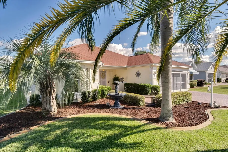 AT THE REQUEST OF THE SELLER, THIS HOME HAS BEEN TAKEN OFF THE MARKET TO ALLOW THEM TO PREPARE FOR MOVING WITHOUT INTERRUPTIONS. SPECTACULAR FULL WATERFRONT VIEW, a BEAUTIFUL HOME located in a CUL-DE-SAC in the desirable Village of PALO ALTO, easily accessible BY GOLF CART to two town squares [Sumter Landing & Spanish Springs] and several nearby championship & executive golf courses [3-5 min golf cart ride]. Upon arrival, you will note the WELL-MANICURED landscaping surrounding its all-paver driveway and walkway leading to a charming, enclosed entryway that contains a French double door entry into a large, tiled foyer. Straight ahead is a breath-taking view of the SPARKLING POND. An open, sizable LIVING ROOM dominates the center of the home. DOUBLE FRENCH DOORS lead into an en-suite MASTER BEDROOM OVERLOOKING THE POND with access to a DOUBLE VANITY SINK master bath containing a huge his/...