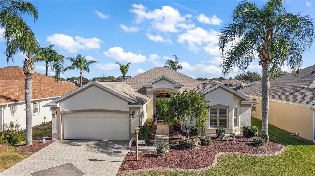 DESIGNER HOME WITH BREATHTAKING WATER VIEWS - BOND PAID! FULL TURNKEY [Optional]! Welcome to this stunning 3/2 waterfront home in the highly sought-after Village of Palo Alto, offering unparalleled water views and an exceptional living experience. From the moment you arrive, the concrete-stucco exterior, enhanced landscaping, and elegant paver driveway and walkway create undeniable curb appeal. Step inside to a spacious open-concept and immediately take in the waterview in the distance beyond the living area featuring vaulted ceilings that enhance the home's bright and airy feel. Sliding glass doors lead seamlessly to the tiled Florida Room, where floor-to-ceiling windows provide a breathtaking 180-degree water view - a perfect spot to relax and soak in the serene beauty. Step outside, and you'll discover the true highlight of this home-a charming outdoor patio off the side of the Florida Room, where you can enjoy tranquil water views while sipping your morning coffee or entertaining guests in a picturesque setting. Adjacent to the living room, the dining area is ideally situated between the kitchen and living space, making it perfect for entertaining. The chef's kitchen boasts a breakfast bar, upgraded appliances, and abundant cabinetry, ensuring both style and functionality. Retreat to the primary suite with a pair of windows taking advantage of the water view, designed for ultimate comfort with private access to an en-suite bathroom with a walk-in shower containing a built-in bench and elegant glass doors, a large designer tub plus an oversized walk-in closet for ample storage. Privacy prevails as another hallway leads to the spacious second bedroom featuring a charming curved bay window, a ceiling fan, and a built-in closet, plus there is a third bedroom that is equally inviting with a large window and built-in closet. The two bedrooms share a guest bathroom containing a tub/shower combo and a single vanity/storage that adds extra convenience. The expanded garage offers room for two cars, a golf cart [or two], and additional storage space. A Prime Location! You are just a short golf cart ride to Spanish Springs and Lake Sumter Landing, and are close to Tierra Del Sol Country Club & Championship Golf Course, Hacienda Championship Golf Courses, Hacienda Regional Recreation Center, pools, pickleball courts, The Villages Regional Hospital, shopping, and dining. RECENT UPDATES: Roof (2020) | A/C (2023) | Water Heater (2020) | Washer & Dryer (2018) This exceptional home is more than just a place to live-it's a peaceful retreat with unbeatable waterfront views. Don't miss your chance to own this gem! Call today to schedule your private showing or virtual tour!