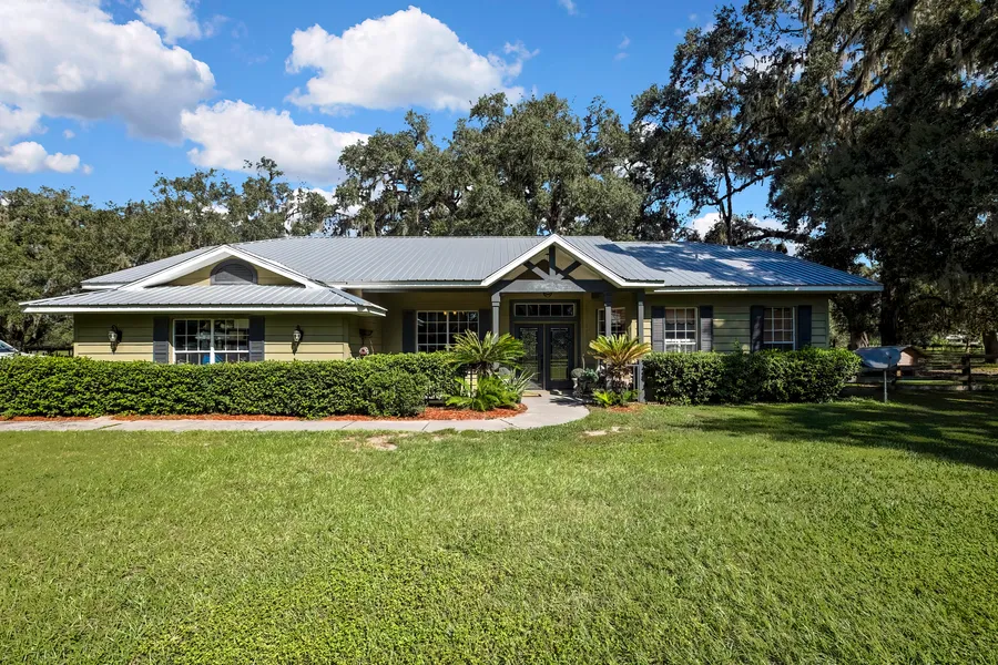 Escape to the country and enjoy the perfect blend of comfort and rural living on this beautiful 10-acre property. Located at the dead end of a paved road, you will be surrounded by majestic live oaks and the peaceful tranquility of quiet country living while still being convenient to town. The inviting 3-bedroom, 2-bathroom concrete block home offers an open concept living and dining room area with 14 ft ceilings and a cozy wood burning fireplace. Bright kitchen with ample storage and granite countertops, a private office right off foyer, and a split bedroom floor plan. The primary suite features a spacious bedroom (14x20), his and her walk-in closets, and large bath with jacuzzi tub. Some of the other key features of this home that will make it rise above the competition include textured concrete exterior siding, a 2018 metal roof, 2018 ac unit, brand new 2025 water heater, and new impact resistant front entry doors. Not to mention this home also has a 2-car garage, fully enclosed sunroom, water filtration system and a 30-amp trailer hookup with concrete pad. Outdoors you’ll find level, useable agriculture acreage ideal for gardening, livestock, or simply enjoying the mature landscaping. This property has never flooded and is high and dry. When you first drive through the gated entry you will see the main horse barn. This Barn is 36x60, features 8 -12x12 stalls with rubber mats, separate feed and tack rooms and a wash rack. This barn was built to last- the 6x6 posts have rebar and concrete 6 ft down and overlapped purlins with hurricane straps to withstand Florida’s unpredictable weather. The second barn features 4 miniature sized stalls, and a bathroom with outdoor shower. The last barn on the property is 16x40. Perfect for storage of livestock trailers/campers or you could easily wall in and have an enclosed shop. Lastly, there is also an 8x30 concrete dog run- consisting of 4 separate pens. There is also a gazebo with fire pit and a chicken coop. This property is the perfect setup for owning a variety of animals! Less than 5 miles from downtown Bushnell and I-75. Also convenient to the Villages, turnpike, Tampa, Orlando, and Ocala WEC! Your country retreat awaits-motivated sellers! Schedule a showing today!