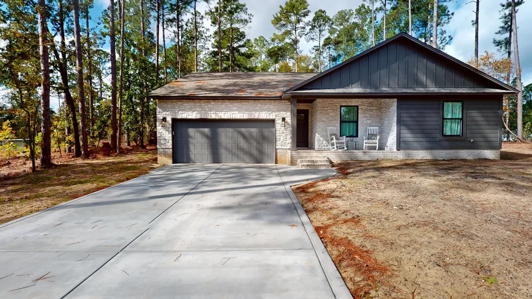 NEW construction home in West Lake Subdivision is sure to impress with fishing available! Beautiful & unique outside with stone and hardy board siding. The nice, rocker front porch hosts a beautiful stamped concrete. Inside is beautiful as you enter the foyer with luxury vinyl plank throughout the home and step into to open floor plan, flooded with loads of natural light from the windows of the great room, formal dining, large kitchen and large eat in area. The great room has a vaulted ceiling, a wall of windows looking out to the back yard and a beautiful, stylish, electric fireplace. Nice formal dining room with windows to the side of the house. The kitchen is dressed with quartz counter tops, beautiful white cabinetry, a large island with gray cabinetry with a farm house sink and breakfast bar, a 8ft x 4ft walk in pantry and stainless appliances to include the stove, dishwasher and microwave. Additional large eat in area with windows facing to the back yard and the back door going out to the huge covered porch with beautiful stamped concrete and large back yard. The home is a three bedrooms split floor plan. The master is large enough for a king size bed and a sitting area, a humongous walk-in closet, an ensuite bath with quartz top vanity with dual sinks, a private toilet room, a large ceramic tile shower and a separate beautiful free standing soaker tub. The second bathroom also has quartz counter top and is located on the other side of the home in the hallway by the other two bedrooms. Nice laundry room, two car garage with opener, border around driveway, view and use of the fishing lake and ready to impress. Gainey Construction is the owner not the builder, but builder is Buddy Ward. J. D. Gainey is the primary officer in Gainey Construction Co. LLC and the broker in charge of Advantage Realty Group, Inc.
