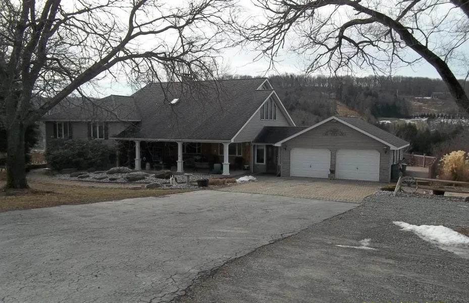 Exceptional 5 bedroom 3 bath home on 7+ acres with great views.Hardwood floors throughout ! Family Room has Hearth style fireplace with projection screen, surround sound stereo plus oak wet bar w/ dishwasher, wine cooler & frig ! 30x30 Master Bedroom w/ cathedral ceiling. Tiered decking w/ bridge, ponds & hot tub & 14x30 pavilion plus 2 bay garage. OGM rights transfer. A superb home.