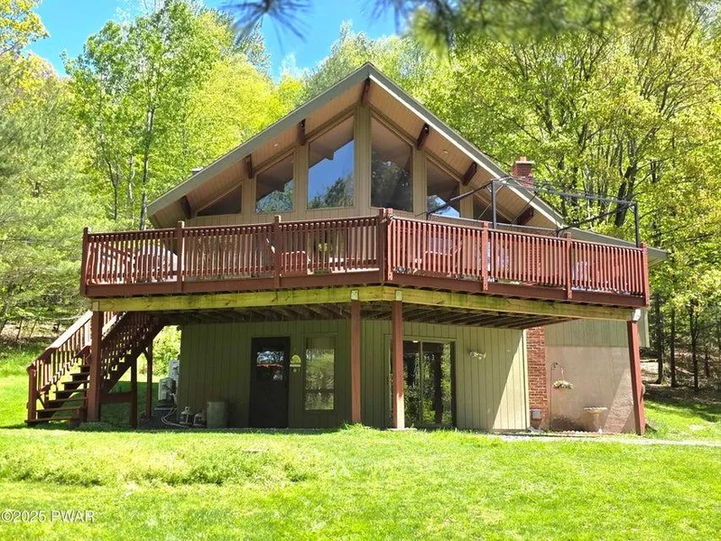 Long private driveway leads to this 3 bedroom, 3 bath chalet on 2 acres. Features bright and airy living room with vaulted ceiling, kitchen with granite counters and stainless-steel appliances, sliders to expansive deck, and lower level family room. Plus detached garage and small pond. Private yet conveniently located just minutes to Interstate 81.