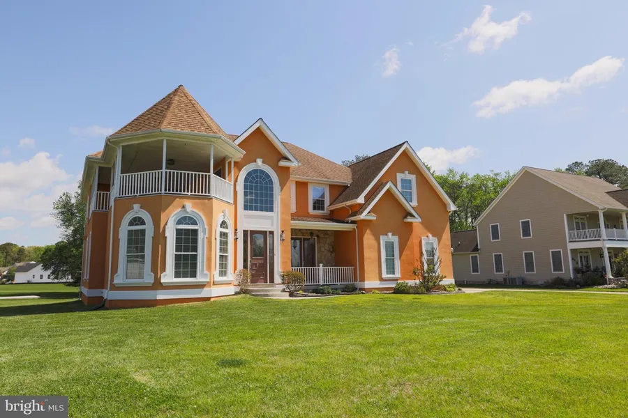 Custom-built, coastal contemporary on Sail Fish Ct.! Winding driveway that can accommodate 6-plus cars carves through lush level meticulous golf-course condition front lawn (thanks to underground sprinklers) to 2-car garage and stunning sunset color 6 BRs/4 bath 2008-built home that touts white trimmed peak roofs, myriad of Palladian windows, posh stone accent and glimpses of water beyond. 2-story foyer is breathtaking with its curved hardwood custom staircase, gorgeous Brazilian cherry hardwood floors/hand-stained pine trim here and in many rooms and bold terracotta paint, just one of many jewel-colored paints throughout home. Exquisite attention to detail in this approx. 4,000 sq.-ft. notch-above home! Robin's blue painted, carpeted media room boasts 3 Palladian windows bump out, dramatic trey ceiling and series of recessed lights and sits on 1 side of foyer, while opposite is elegant, gold-painted DR with oversized entrance and French doors. This trio of space is rich in color and generous in square footage. Home is remarkable blend of luxurious, livable space in Lewes and entertaining seems effortless thanks to its spectacular interior amenities including 1st-level ceiling surround system! Foyer opens to 2-story grassland green great room, where its soaring ceilings make room even larger! On back wall, 2 Palladian windows/2 single French doors flank masterpiece floor-to-ceiling custom stonework, wood-burning FP with marble hearth. Mix of abundant natural light, warm tone of hardwoods/trim, and rustic texture of stone FP offer gracious and inviting ambiance. Upscale enough for pre-dinner-party drinks and casual enough for post-family-dinner movies! 2nd floor balcony overlook adds heightened interest. Sweeping kitchen and great room are fused together with open pass-through window and extended countertop, creating fluid movement between rooms. Tuck-away stools line side of great room, built-in glass rack with rows for easy-to-reach barware hang above and rich built-in wine rack makes end of counter architectural beauty and perfect perch for simple-to-store wines! Vivid terracotta-hued kitchen consists of cherry cabinetry blended with earth-hued granite countertops, while 2 pendant lights highlight 6-sided center island with sink, interior wood beadboard finish and bar chairs. Bay window stretches across wall and offers extra bumped out space for sun-drenched breakfast nook. Table and chairs outfit area, while French doors lead out to deck. Intermittently throughout home one can enjoy water views! 1st-floor primary BR in blend of terracotta/yellow paint is sweeping in size and can easily afford spacious retreat area where one can re-charge and 2 large walk-in closets make it a breeze to store all-seasons wardrobes! Absolute charm is 2-sided gas FP. Imagine cold winter mornings with coffee in hand and FP wrapping you in cocoon of warmth! Primary, private tile floored bath is true haven of relaxation. It also takes advantage of gas FP that sits before 6-jet jacuzzi! There is also Rain head and jets shower with bench, private water closet and vanities that flank built-in makeup vanity! 1st floor also touts big laundry room and statement-making PR with gold-trimmed, floral decorated pedestal sink. Upper level boasts BR with its own private bath, perfect for guest suite, along with 4 additional roomy BRs and 2 full baths. Appreciate magnificent 2nd level covered porch that offers peaceful and private spot, while lattice-trimmed open deck sprawls across back of home on main level and backs to tree-ringed backyard. Just steps away are resort-like community amenities. Swim laps or lounge lazily around pool. Workout at fitness center. Play a round of tennis. Enjoy water fountain in lovely pond. When getting out and about is on the agenda, home is just 10 mins. to Rt. 1 and all-around amenities, and merely 20 mins. to Rehoboth Beach and boardwalk. Striking interior, spacious backyard and spectacular water views on Sail Fish Ct.!