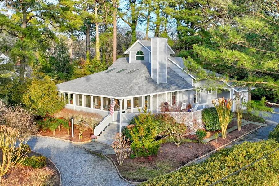 Presenting a rare opportunity to reside in the highly coveted, tree-lined community of Henlopen Acres, where residents lovingly maintain their families' intergenerational coastal homes and seldom sell. Nestled between the Atlantic Ocean and the picturesque Lewes and Rehoboth Canal, this 5-bedroom and 4-bathroom home is within walking distance to downtown Rehoboth Beach and just a block and a half stroll to the private Henlopen Acres Beach Club and tennis courts. Savor ocean pine breezes while entertaining guests on the comfortable, interconnected 3-season porch, sunroom, and expansive TimberTech decks, complete with a gas line for grilling. The panoramic sunset views of the private Henlopen Acres Marina and preserved wetlands create a captivating backdrop and transform your living space into a haven for relaxation and natural beauty.The interior boasts soaring beamed cathedral ceilings with skylights and towering windows, french doors, and sliders flooding the open-concept living space with natural light. Wide plank Heart Pine floors and a recently converted gas fireplace enhance the main living area's warmth. The kitchen features modern stainless steel appliances and bright white cabinets, creating a sleek and timeless aesthetic. With ample counter seating for four, the open kitchen seamlessly connects to the dining and great room. This design enhances the home's spacious and interconnected feel, ideal for daily living and grand entertaining. The main level also features a spacious light-filled owner's suite with canal views, a guest room, a full bath, a private Nanny/guest suite, a laundry room with a second refrigerator, a walk-in pantry/storage room with two entry points, and a mud room with entrances from the side drive and the back yard. The central illuminated staircase rises to two additional private guest rooms with a convenient Jack and Jill bathroom. The loft and office spaces offer versatility and functionality, while the attic provides extra storage. Experience a unique birds-eye view of the expansive great room and dining areas cascading to the inviting porch rooms, creating a harmonious flow through this thoughtfully designed home. Sited on a generously sized .52 acre lot, the stately circular front drive and second long drive provide coveted off-street parking. Mature shade trees enhance the professionally landscaped outdoor oasis. Also included is a storage room for bikes and boards, an outdoor shower, a well, and an irrigation system. Explore the potential for a pool and hardscaping, complete with a fire pit, creating the perfect setting for memorable moments with family and friends. Please come take a look and realize the limitless potential this rare opportunity will afford the discerning buyer.