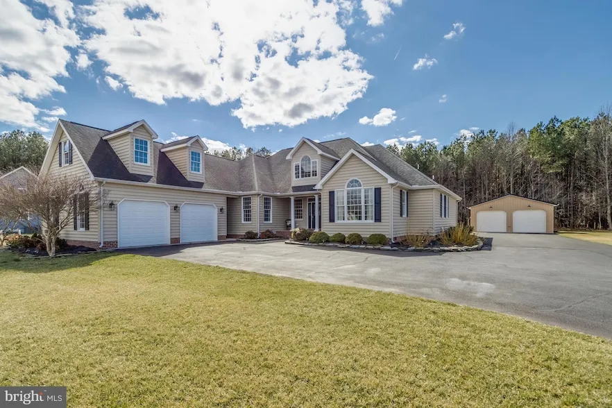Spacious and versatile, this 4+ bedroom, 3-bathroom home sits on 1.3 cleared acres, offering ample space inside and out. The well-designed floor plan features beautiful hardwood floors throughout and includes three guest bedrooms on one side, complete with a hall bathroom and a Jack-and-Jill bath, while the spacious primary suite is tucked away for privacy, boasting a walk-in closet, jacuzzi tub, and walk-in shower. The heart of the home is perfect for gathering, with a formal dining room accented with custom trim, a vaulted-ceiling living room, and a well-appointed kitchen featuring bar seating and a breakfast nook that easily accommodates six or more. A large laundry room adds convenience, while the second-floor bonus room offers true flexibility currently used as an apartment-like space with a bedroom, living area, and room for a pool table. Step outside to enjoy the rear deck, perfect for outdoor entertaining or relaxing. The attached 2-car garage is complemented by an additional 2-car pole building, ideal for extra storage, hobbies, or workspace. With plenty of room for a pool, this property is perfect for boaters, RV owners, or contractors in need of space. Centrally located in Sussex County, enjoy easy access to the beaches, Milford, Dover, and Salisbury.