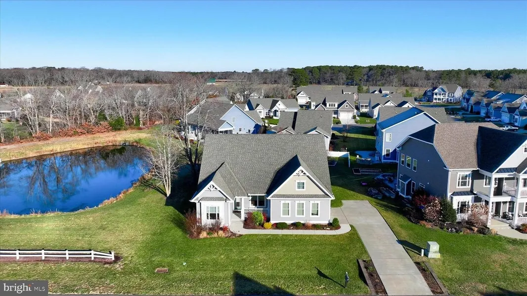 Welcome to this inviting three-bedroom contemporary home, beautifully positioned beside a tranquil pond and framed by lovely landscaping that enhances its peaceful setting. A welcoming front porch sets the tone, offering the perfect place to relax and enjoy the natural surroundings. Step inside to discover rich wood look luxury vinyl plank flooring flowing through much of the main living area, creating warmth and continuity. To the right of the foyer, a formal dining room with classic chair railing provides an elegant space for gatherings and special meals. To the left, two comfortable bedrooms are thoughtfully placed near a full hall bath, one of which enjoys calming pond views that bring the outdoors in. The heart of the home opens into a bright, open concept living space where the living room, breakfast area, and sunroom come together beneath a high vaulted ceiling with recessed lighting. This layout invites connection and conversation, whether you are hosting guests or enjoying a quiet evening at home. The sunroom is a standout feature, offering a peaceful spot to unwind while taking in beautiful pond views year-round. The kitchen is both stylish and functional, designed to keep you connected to the living areas while you cook. It features 42-inch cabinetry, granite countertops, a gas cooktop, double wall oven, pantry, and a center island with pendant lighting and breakfast bar seating, making it ideal for casual meals or entertaining. Just off the kitchen, the laundry room includes a utility sink and provides direct access to the two-car garage for everyday convenience. Window blinds are already in place throughout the home, and a tankless hot water heater adds efficiency and comfort. The primary suite offers a private retreat, generously sized with a large walk-in closet and a spa inspired en suite bath. Enjoy an extra wide tiled glass door shower with multiple spray heads and a built-in bench, along with a dual granite topped vanity that adds both style and function. Outside, the spacious backyard is partially fenced, offering room to relax, garden, or enjoy outdoor activities while still taking in the peaceful pond setting. Located close to the Assawoman Wildlife Area, Freeman Arts Pavilion, and just a short drive to Bethany Beach, Fenwick Island, and Ocean City, this home perfectly blends comfort, nature, and coastal convenience.