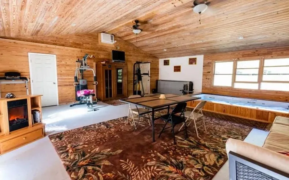 This Rustic, Private, Luxurious 3500+ sq. ft. custom cypress log cabin with 18' Cathedral Ceilings in LR, Master Suite (w/screened porch), and Spa Room, 2 story Stone Fireplace, Fully equipped Gourmet Kitchen, dining room, laundry room ( steam /sanitize washer and dryer), & indoor attached 900 sq ft. Spa Room. 2 covered Porches allow for enjoyment of the private 5+ acre wooded fully fenced & gated property.