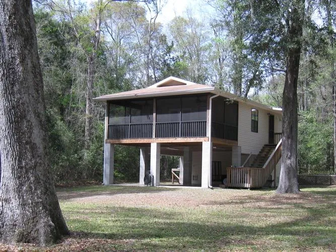 Screened-in porch overlooks the 7.10 acres and the view is breathtaking. Property located between parks and boat ramps. 1BR 1BA home is on stilts but workshop on bottom can be converted into a second bedroom.
