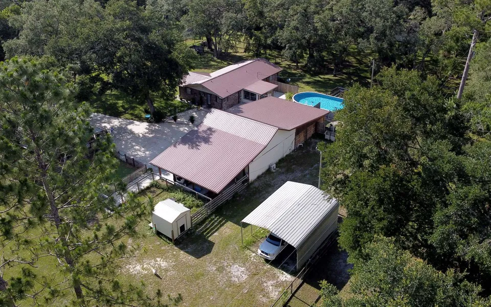Green acres, 2.8 miles miles from Downtown Live Oak with no restrictions. This pool home has multiple outbuildings including a studio/inlaw with full kitchen, bath and laundry. Large mac daddy chicken koop, two carports and air conditioned dog house convey. Enjoy being outdoors under the expansive patio-pool area or working in the insulated garage. The entire 2.1 acre property is surrounded by 2x4 inch wire fence with two large gates. Front gate is electric. Plenty of concrete for the toys to rest on. The inside of the home features custom updating including new tile and marble baths and a jacuzzi, surround sound in and out of residence. Home is set with security. 2022 HVAC, 2019 Water Heater, 50 yr metal roof and much more.