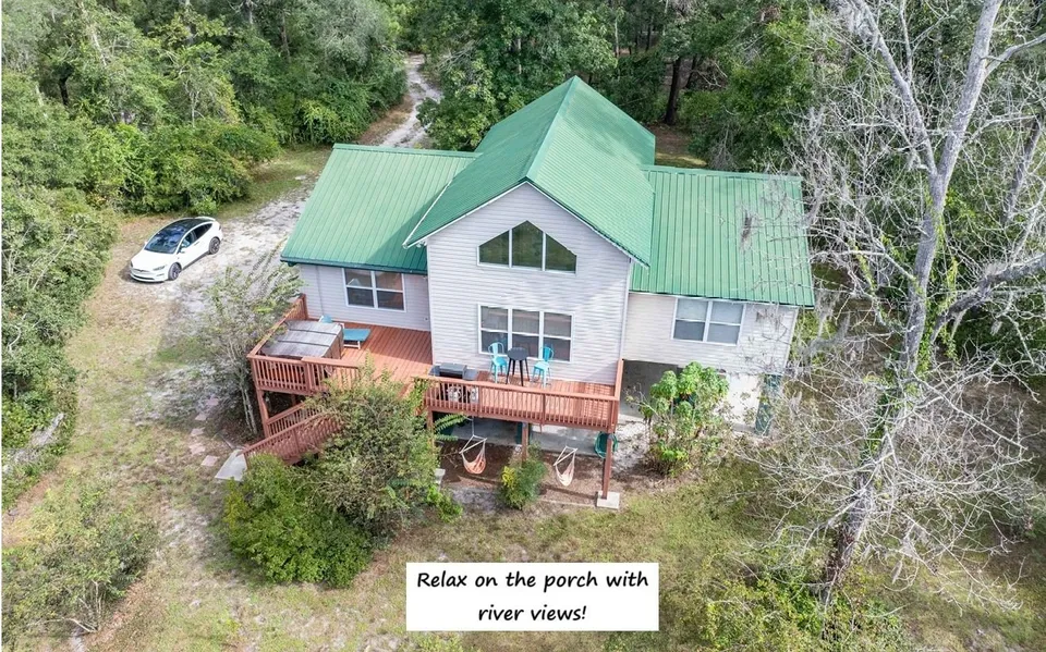 With 18.3 acres of pristine land with approximately 600 feet of serene river frontage, this inviting 3-bedroom, 2-bathroom is surrounded by planted pines with an agricultural exemption. It's a nature lover’s paradise with complete privacy on all sides, including across the river. Key Features • Spacious & Bright Interior: Open-concept living area with vaulted ceilings and abundant natural light, creating a warm and inviting atmosphere. • Modern Kitchen: Fully equipped with stainless steel appliances, granite counter tops, and a breakfast bar, perfect for entertaining. • Luxurious Primary Suite: Primary bedroom with two spacious closets and an en suite bathroom featuring a whirlpool tub for ultimate relaxation. • Unique Loft Bedroom: Cozy loft-style bedroom, ideal for guests or a private retreat. • Outdoor Paradise: Expansive rear deck overlooking the river, a private dock with a floating platform, and a hot tub for year-round enjoyment. Covered parking or recreational area available beneath the house. • Land & Income Potential: 17.3 acres of planted pines with agricultural exemption, offering tax benefits and future timber revenue, currently operating as a short-term rental property. • Additional Amenities: High-speed internet, central HVAC, outdoor elevator, nature trail, zip line, 2+ car stand alone garage with well & septic for possible second dwelling, unfinished cottage for possible guest quarters.