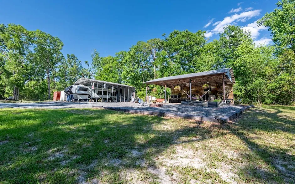 This 5-acre property sits on the Santa Fe River in Branford, Florida, with 153 feet of direct river frontage. A 662-foot wooden dock extends over the river, ideal for fishing, kayaking, or relaxing. The land includes underground 200-amp electrical service, a 500-gallon propane tank, and a septic system with two pump chambers. A self-maintaining well pump supplies a water purification and conditioning system. A 23 kW backup generator ensures continuous power during outages. A 1,200-square-foot pole barn includes an outdoor kitchen with a propane 4-burner stove, full oven, full-size refrigerator, butcher block countertops, and a tankless water heater serving the sink, dishwasher, and outdoor shower. Eight fans cool the space and help deter insects. A 60-amp hookup supports a hot tub or a third RV. A separate steel barn features two 50-amp RV hookups with septic access. Three shipping conta...