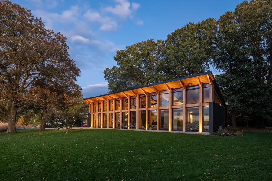 Set on the natural bank of the Tred Avon River, this modern home utilizes white polished concrete supporting a Douglas Fir butterfly roof that celebrates the interplay of light and industrial craft. It is the first of its kind on the Chesapeake Bay and established an unprecedented environmental