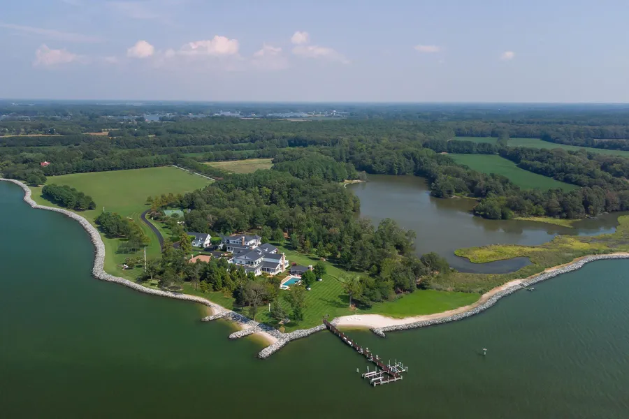 Magnificently resplendent, captivating, and wholly irreplaceable, Cecilias Point is an offering unlike any other. Situated on the Chlora's Point peninsula along Marylands glamorous Eastern Shore, the estate boasts 3000 feet of protected shoreline and spans 117 acres. It serves as a serene contrast to urban living, affording an authentic getaway to a place of sculpted grounds and open expanses, permeated only by the gentle sounds of the Choptank River. A long, meandering driveway winds through a verdant canopy of trees, a bubbling pond and white picket fences before skimming alongside the shoreline and concluding. The motor court, with its lighted entry pillars, comprises herringbone brick pavers and presents a regal introduction to the majestic estate. Distinctly coastal yet ornate in detail, slate shingles and striped awnings meet Corinthian columns in an old-world fashion reminiscent o...