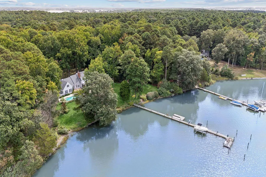 Location, Westerly Views, Sailboat Depth Water, Privacy! Welcome to this stunning waterfront home, a true sanctuary overlooking Plaindealing Creek. Spanning 4074 square feet, this residence includes 4 spacious bedrooms, 3 full baths, and 2 half baths, providing ample space and comfort for family and guests. Sited on 5.06 acres of beautifully manicured grounds and stunning mature trees, the property has 327' +/- of natural shoreline and 6-7' MLW, ideal for boating enthusiasts. The private pier features two boat lifts, three deep-water slips, and a large floating dock. Enjoy breathtaking 180-degree views of the water from much of the house, or from the in-ground heated saltwater pool. Inside, you will find beautiful hardwood flooring throughout and an abundance of natural light. The living room and sunroom showcase big views of the pool, back yard, and creek from multiple sliding glass doors leading to an expansive wrap-around waterside deck. The large family room w/ cathedral ceiling has French doors to the deck, and a wonderful wood-burning fireplace. The main level primary bedroom with ensuite bath and large walk-in cedar closet are private and overlook the back yard and creek. Adjacent is the separate office with great built-ins and desk. The light-filled eat-in kitchen with center island is convenient to the formal dining room, a pantry/mudroom area, and wonderful breezeway with brick flooring serving as a screened porch/additional sunroom. On the second level, enjoy three well-appointed guest bedrooms, a full hall bath, and a second access point to the walk-in attic space over the garage. The home's thoughtful design includes extensive storage space & cedar closets, an enormous walk-in attic, bonus area accessed by a spiral staircase, and a dedicated fitness room complete with an adjacent steam shower/steam room. An attached 2-car garage with access to the walk-in attic overhead, workshop, and wonderful built-ins, and storage shed complete the property.