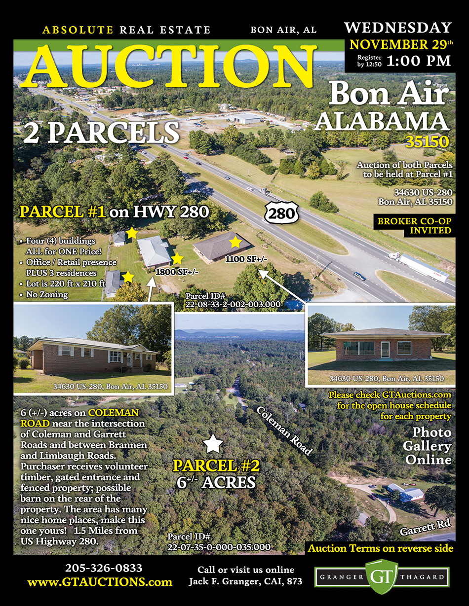 Properties (2) are just south of Childersburg (on US Hwy 280), Bon Air proper, and just north of Oak Grove, AL and acreage on Coleman Road...