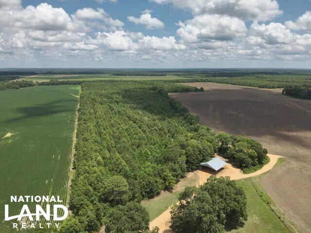 Improvements include a well-maintained 3-bedroom, 1.5-bath brick ranch-style home, ideal as a hunting camp or full-time residence, along with a 40' x 50' metal equipment shed and shipping container for secure storage. With over 2,500 feet of paved road frontage and multiple entrances, access is easy and flexible for farming, hunting, or future development.