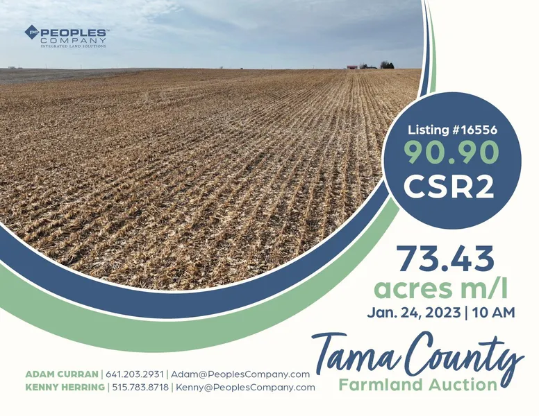 Peoples Company is pleased to present the Ruth E. Smith Estate & Trust in the sale of 73.43 acres m/l of highly productive tillable farmland. The auction will take place on Tuesday, January 24th, 2023 at 10:00 A.M. at the Dysart Community Center in Dysart, Iowa. This tract of land is located Southwest of Dysart in Section 3 of Clark Township in Tama County, Iowa. This highly tillable property consists of approximately 71.78 farmland acres with a weighted average CSR2 of 90.90. Soil Types include Dinsdale silty clay loam, Colo-Ely Complex, and Tama silty clay loam with slopes from 0 to 9 percent. The land is excellent in quality with very few waste acres and is located within minutes of the local Co-op. The current farm lease has been terminated and will be available to the buyer(s) for the 2023 farm year. This auction can also be viewed through the Peoples Company mobile bidding app and ...