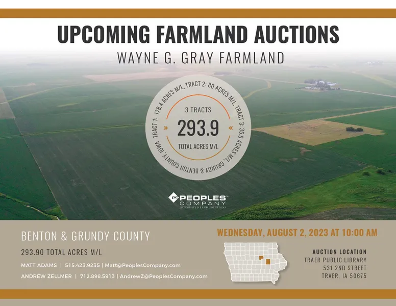 Grundy and Benton County, Iowa Land Auction - Mark your calendar for Wednesday, August 2nd, 2023 at 10:00 AM! Peoples Company is pleased to represent the Wayne G. Gray Estate in the sale of 293.9 acres m/l of prime Grundy & Benton County, Iowa farmland. All three farms carry top-producing clay loam soils and are located in the heart of some of the top farming areas in the Midwest.