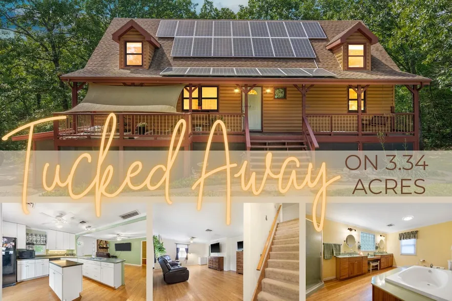 This beautifully updated property offers a unique setup with two living areas, each featuring a full kitchen adorned with granite countertops. With 5 bedrooms (1 non-conforming) and 3.5 bathrooms, this home caters to convenience and privacy. The cozy wood-burning stove and wood-burning fireplace adds a touch of warmth to the spacious interiors, while luxurious touches like a soaking tub and walk-in closets elevate your daily living experience. Spanning 3.34 acres, this residence provides an ample outdoor expanse for relaxation or leisure activities. Energy efficiency is seamlessly integrated with installed solar panels, reducing utility costs and contributing to a greener lifestyle. The exterior boasts a massive 30 x 60 quonset shop building (concrete floor) with an additional 20-foot overhang, perfect for hobbies or storage needs. This space could be used for a commercial endeavor as well - the possibilities are endless. Enjoy the serenity of being tucked away off Fall Creek Road, with approximately 880 feet of frontage. The property features a charming covered front porch, screened-in lower-level patio and a practical circle driveway for easy access. Plus, you're just a short drive from the vibrant local scene shop, dine, and explore all that the Branson strip has to offer! You can access both Table Rock Lake and Lake Taneycomo within 10 minutes. This home beautifully combines the tranquility of rural living with proximity to city conveniences. Don't miss out on making this your new haven! SOLAR PANELS ARE INCLUDED IN PRICE AND NO MONIES OWED ON PANELS. PROPERTY IS LOCATED IN HIGH DENSITY RESIDENTIAL ZONING - DOCUMENTS ATTACHED - Vacation Rentals allowed with fire supression system.