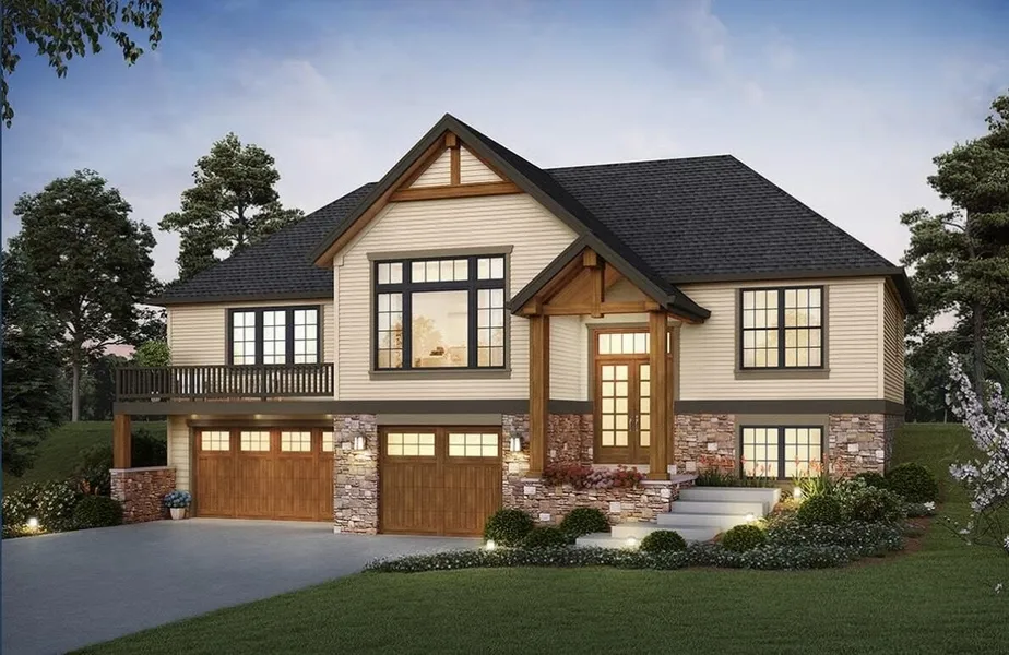 Located in Whitetail Crossing neighborhood, this beautiful new construction home offers a functional and stylish split-level layout designed with comfort and quality in mind. The exterior features a combination of stone and vinyl siding with classic craftsman-style accents. Step inside to find hardwood flooring throughout the main living areas, carpet in the bedrooms, and tile in the bathrooms and laundry room. The open-concept kitchen includes real wood soft-close cabinetry, granite countertops, a large island, walk-in pantry, and energy-efficient LED lighting. The living room features cathedral ceilings with 9-foot walls and an electric fireplace as a focal point. The spacious primary suite includes two closets, a double vanity in the en-suite bathroom, and direct access to a private deck. A covered back deck provides additional outdoor living space perfect for relaxing or entertaining. Additional features include a 3-car garage and a large storage area, all finished in a neutral earth-tone color palette. Disclaimer: Renderings are intended to provide a general idea of the final design. Actual colors and finishes may vary. The builder is currently incorporating neutral earth tones throughout the home. Buyers who contract early in the construction process may have the opportunity to customize selections and choose available upgrades.