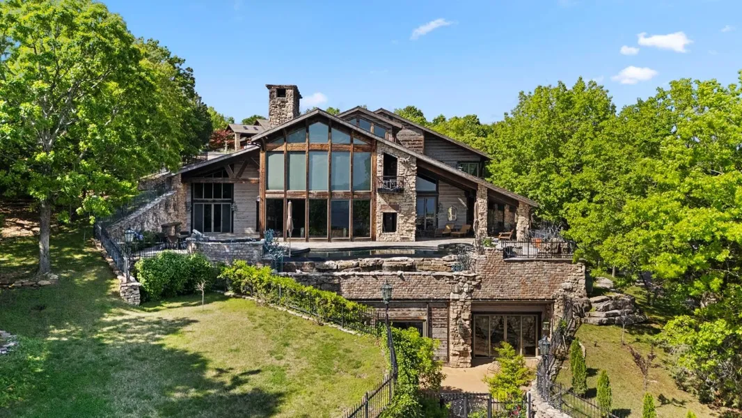 Experience unparalleled luxury at this breathtaking estate where Old World artistry meets exceptional American craftsmanship, nestled within an exclusive gated community with top-tier amenities and panoramic views of Table Rock Lake. Spanning 13,800 square feet across four levels, this extraordinary residence boasts eight bedroom suites, creating the ultimate retreat for grand gatherings and lavish entertaining. A picturesque half-moon driveway framed by wild ivy leads to a vaulted, wooden-beamed entryway with skylights, opening to a majestic stone staircase surrounded by lush landscaping and intricate tailored metalwork. Built with hand-hewn chink logs, local stone, and a shake roof, the home exudes timeless elegance, while inside, a grand living space showcases a custom floor-to-ceiling stone fireplace crowned with a one of only two in existence terracotta A-B eagle from Chicago, datin...