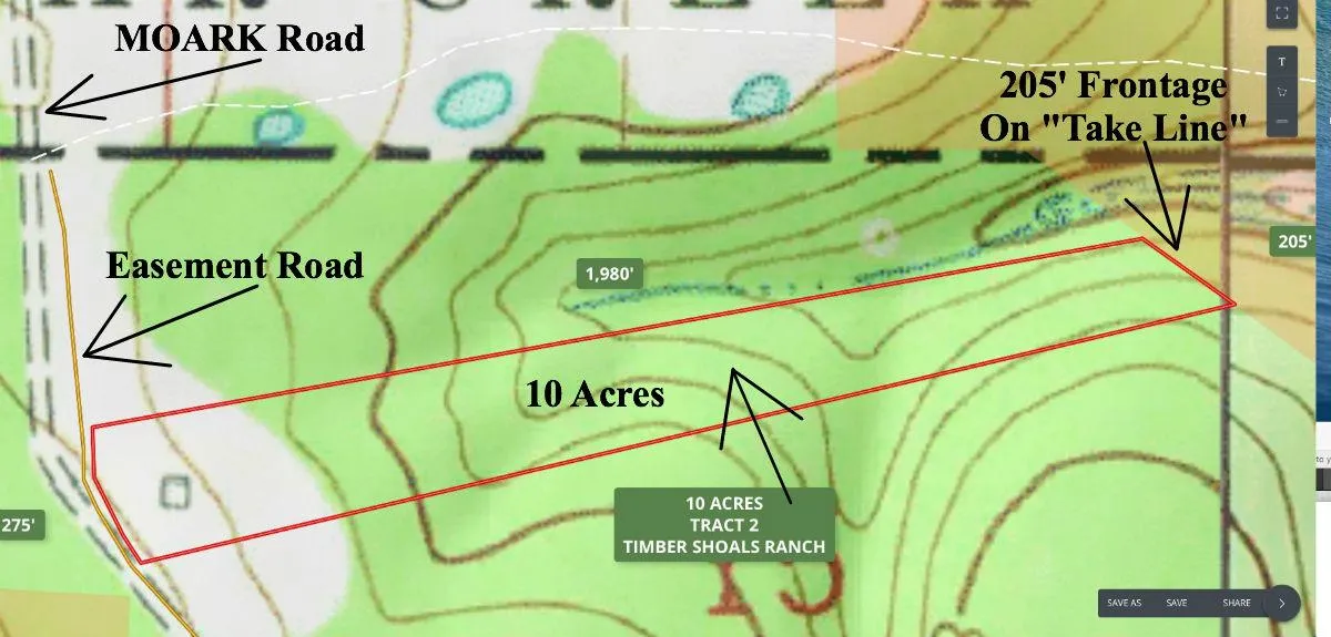 To get to the property from Branson you can go east on Highway 76 until you come to Highway 160. Then go east on Highway 160 to Highway M. Now follow Highway M all the way down to MO/ARK Road and take the easement road to the property. Once you take a left at the end of MOARK Road, proceed south on the gravel easement road for about 1/8 of a mile and look for the sign that says "Tract 2".