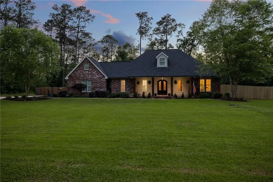 This stunning 3-bedroom, 2.5 bath French-Country style home offers the perfect blend of comfort and style. Featuring exposed brick accents and soaring 11-foot trey ceilings that make the interior feel open and inviting, custom metal front door with 4-panels that open for fresh air, intricate tile work throughout, custom lighting, and 2 beautiful fireplaces. Enjoy cooking and entertaining outdoors with a fully equipped outdoor kitchen with 2 panoramic doors that completely open for an indoor/outdoor living experience, while the spacious fenced yard provides ample room for pool, garden or play area while enjoying the almost one and a half acres of picturesque views!Additional highlights include: Two and half car attached garage, optimal space for parking your lawnmower or golf cart, plenty of storage space and expansive lot with endless possibilities. Flood zone X. Don't miss this unique opportunity to own a property that combines privacy, charm and functionality. Book your private showing today!