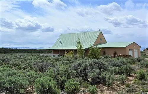 At 7,700 feet elevation, the home is set on 200 acres of piñon, juniper and sagebrush and bordered on the north and south by Carson National Forest. Hand-designed and built, the well-maintained home is 2,258 square feet. Construction consists of 25" thick adobe walls surrounded by 2' x 6' insulated stud walls and double paned wood windows. This type of construction ensures warmth in the winter and the retention of cool air in the summer. The pro panel metal pitched roof provides all-weather durability. Ground floors are brick on slab-grade. The upper floor consists of 3/4 inch solid oak. The kitchen is of an open design and features ample storage via Kraft-Maid maple cabinets, Corian countertops, a Waterford wood burning cookstove, Summit electric refrigerator and a propane cook top. A washer and dryer are located in the oversized, finished and insulated (2.5) car garage. There is also a small redwood greenhouse attached to the garage.
