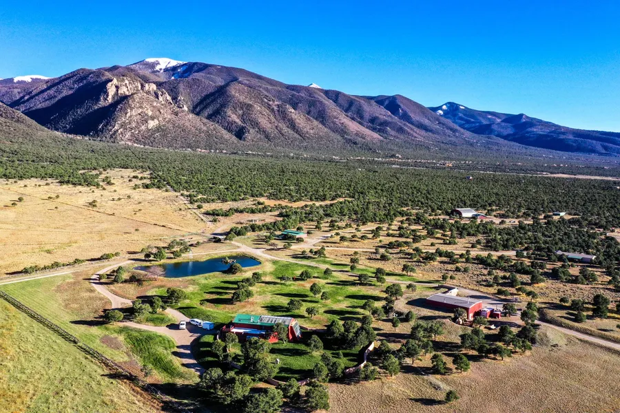 Latir Mountain Ranch is the classic gentlemans ranch, set against the breathtaking backdrop of the Rocky Mountains. This serene retreat includes a stunning 2-acre trout pond, separated from the main residence by a lush, manicured 2-acre pasture and orchard. The property is home to three residences, offering ample space for family and guests. It also features extensive facilities including a large shop, a 6-stall barn, a massive greenhouse building that doubles as a barn and equipment storage, and a one-bedroom finished apartment for additional accommodations. The ranch features 661 deeded acres complimented by a section MOL of NM State Land lease.