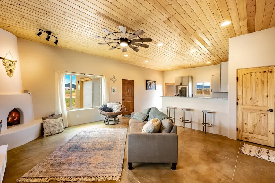 Brand new 2022 home, beautifully designed, efficient open floor plan with attention to detail. Kiva fireplace, tall ceilings, beautiful countertops and stainless appliances, natural gas radiant floor heat throughout including radiant heated oversized attached garage (not included in sq ftg). Equipped with fast Kit Carson fiberoptic internet. Built with energy efficiency. On .86 acres with a portion of the acreage fenced. Nice & tranquil new neighborhood. Perched above the rest of town for the big views of Taos Mountain.