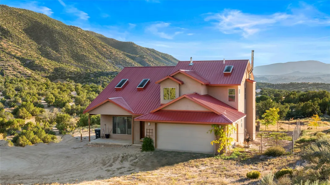 Built in 2011, this elegant and modern 2,400 sq. ft. Northern New Mexico home offers privacy and stunning views. The pitched red roof against the blue skies and white rocks of Ojo Caliente welcome you. Once inside, enjoy the open, two-story great room that is filled with huge windows, adjacent to the dining room. The gourmet kitchen has granite counter tops, stainless steel appliances, ample storage, including a pantry, a breakfast nook built with bay window. A cozy area for relaxing and casual living adorns the kitchen. On the main floor there is a powder room, large laundry room, and direct access to the spacious two-car garage. French doors lead you out to the back deck with beautiful mountain views and vast space to unwind. Outside there is also a secure dog area for your pets to play. Upstairs there is an office, three bedrooms, and two full bathrooms. The spacious master suite has a walk-in closet and an ensuite spa bathroom with a walk-in shower, double sinks, and large tub. The home has elegant lighting fixtures, engineered wood, tile, and carpeted floors, custom paint finishes, quality window treatments, and so much more. There is a shared well, in-floor radiant heat, evaporative cooling, and a private septic. There is not an HOA. This gorgeous home will not last long. Enjoy the quietude of Northern New Mexico and all the surrounding nature and the convenience of being near Santa Fe and Los Alamos. Overnight notice required for showings.