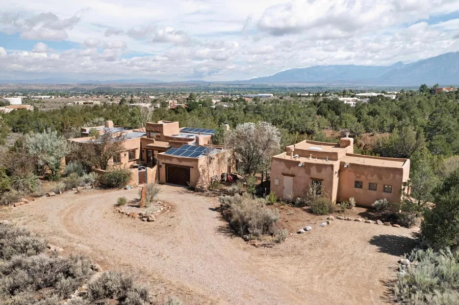 On 3 acres of beautiful land covered in mature Pinon and Juniper trees with breathtaking views of Taos Mountain, the main home and guest house provide unchecked privacy and comfort. The Pueblo-style main house, built in 1993 with adobe construction, has radiant in-floor heating, Aspen latilla and viga ceilings, flagstone and solid wood floors, and diamond plaster walls. The Kiva fireplace adorns the inset living room with large bancos for fireside enjoyment. The detached guest house ? built in 2007 and designed with all the bells and whistles of the Pueblo Revival style ? has radiant in-floor heating, custom plaster walls, high ceilings of rough sawn lumber and large Vigas, tiled counter tops, and big picture windows for enjoying the spectacular mountain views. The owned grid tie solar system keeps electricity bills very low and provides most of the electricity used. The opportunity to p...