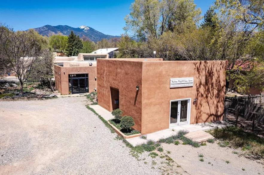 PRIME RETAIL AND DEVELOPMENT OPPORTUNITY IN TAOS! Whether on the hunt for a multi-functional abode or a quality investment just off the iconic Kit Carson Road, this attractive well well-maintained Taos contemporary studio space is 2,035 sq. ft. The gallery and studio property might check off all the boxes on your wish list! Beyond the gate and gravel drive lies the sanctuary of the late Veloy Vigil, a renowned figure in the world of printmaking, sculpting, and coloring. Through glass-inlaid double doors, enter the open-concept studio, where you ll have plenty of room for innovations and future development. High-exposed ceilings and textured tile flooring provide a contemporary canvas for your imagination, enhanced by natural and track lighting that sets a laid-back ambiance. Lease it, create a live/work environment, or transform it into the ultimate desert haven for your lifestyle. With a utilitarian work area, kitchen, and side and back exits for easy access, this versatile building also includes ample open parking. Outside, the generous yard is ideal for exhibitions, receptions, or intimate garden gatherings. Separate gallery spaces can be created to maximize the rental capability. The paved backyard is dotted with several mature trees. A fantastic location means you have excellent visibility, easy access to parking along with a good volume of drive-by and foot traffic as you re just a short distance from Taos Plaza (one block east) and its vibrant Southwestern culture, restaurants, hotels, coffee shops, and chic boutiques. Zoning is C-1, to include multi-family residential development to R-14 density. An opportunity like this is too good to pass up, so come for a tour before it passes one you by!
